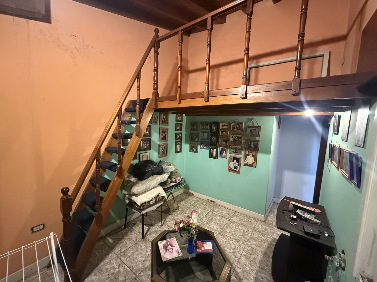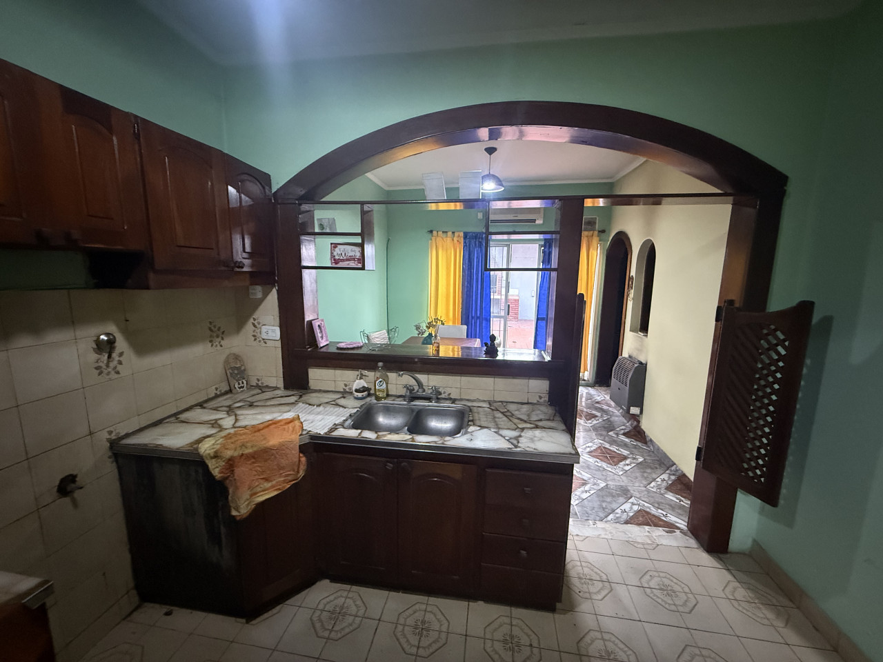 La cocina amoblada, equipada con mesada, bajo mesada y alacena, conecta mediante un pasillo con dos habitaciones principales y un baño completo. Desde la cocina también se accede a una tercera habitación con entrepiso, perfecta como dormitorio adicional, escritorio o espacio de guardado.